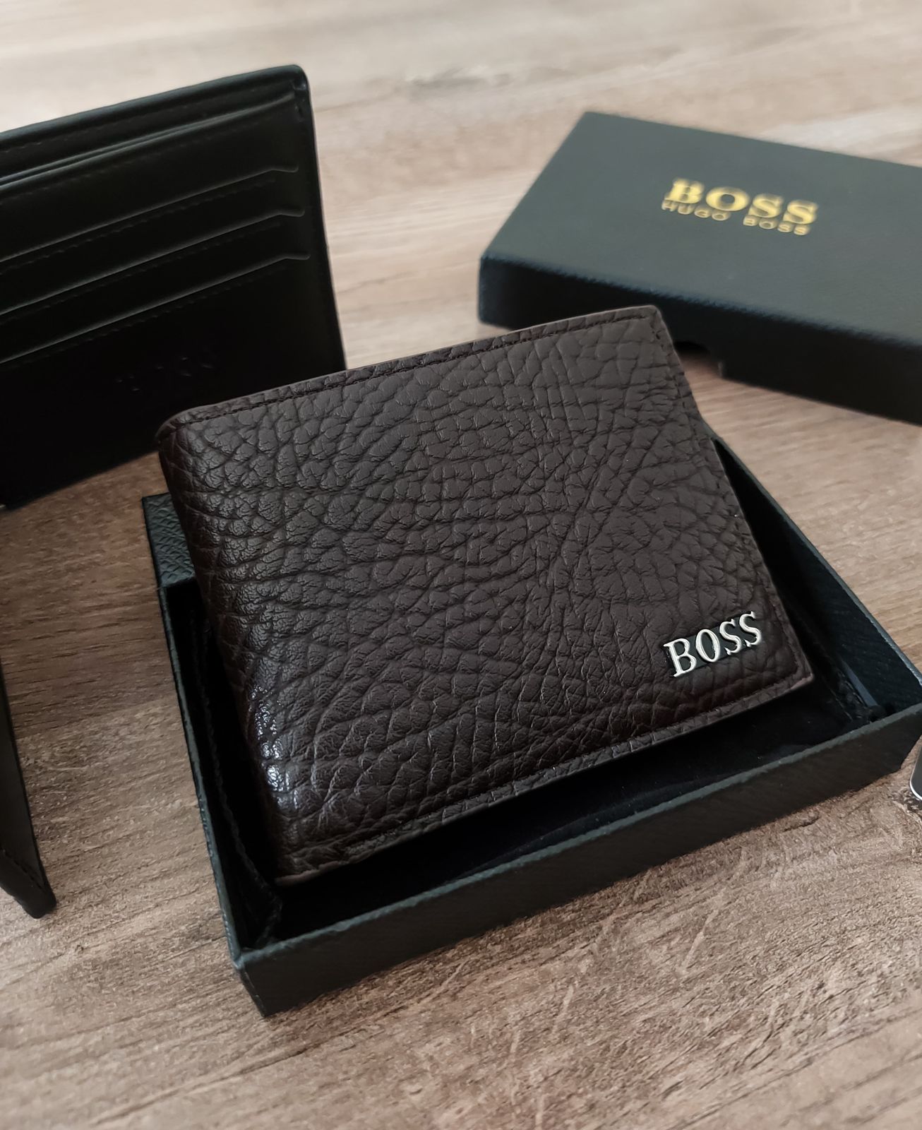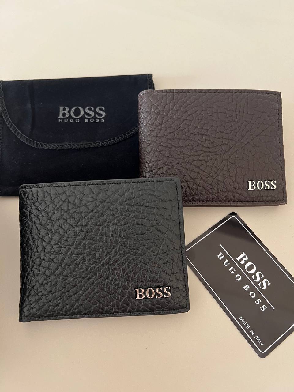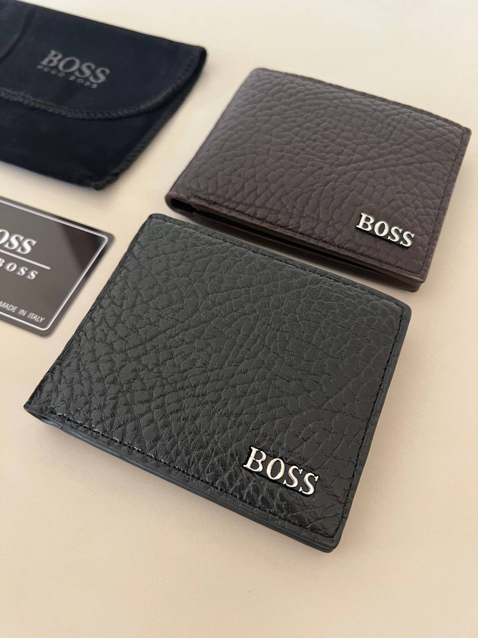 المحفظة بتتوفر بلونين أساسيين (أسود وبني غامق)، وشعار معدن محفور بشكل احترافي في الزاوية الأمامية.